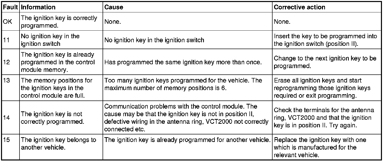 The table gives the different codes for faults which can occur when programming an ignition key.