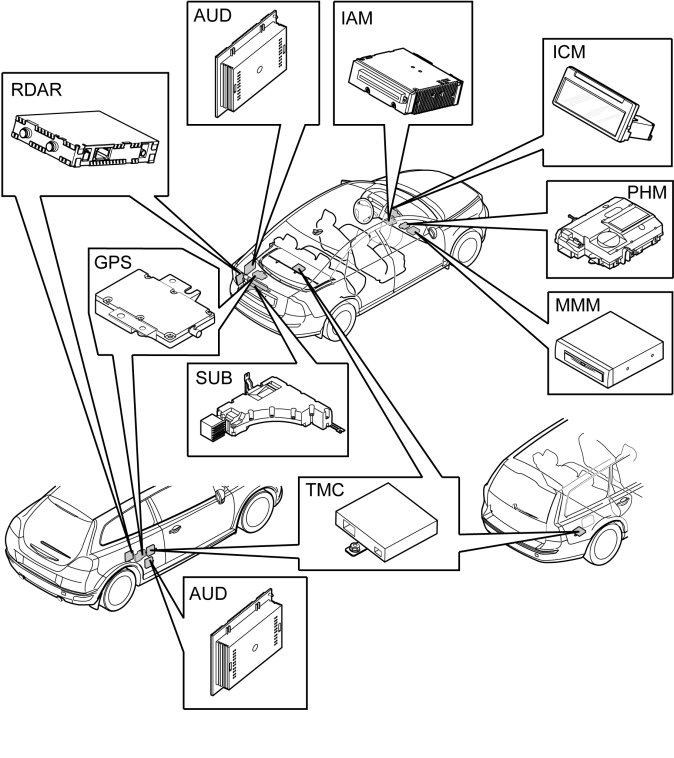 The infotainment control module (ICM) deals with monitoring and communication on the MOST network. The infotainment control module (ICM) is in turn monitored by the central electronic module (CEM) on the CAN network.