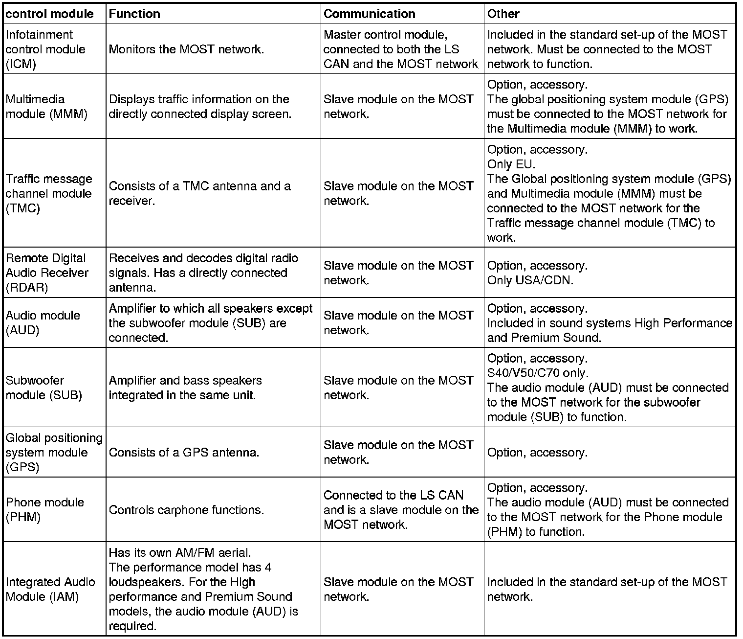 The table below lists all the control modules which may be included in the MOST network.
