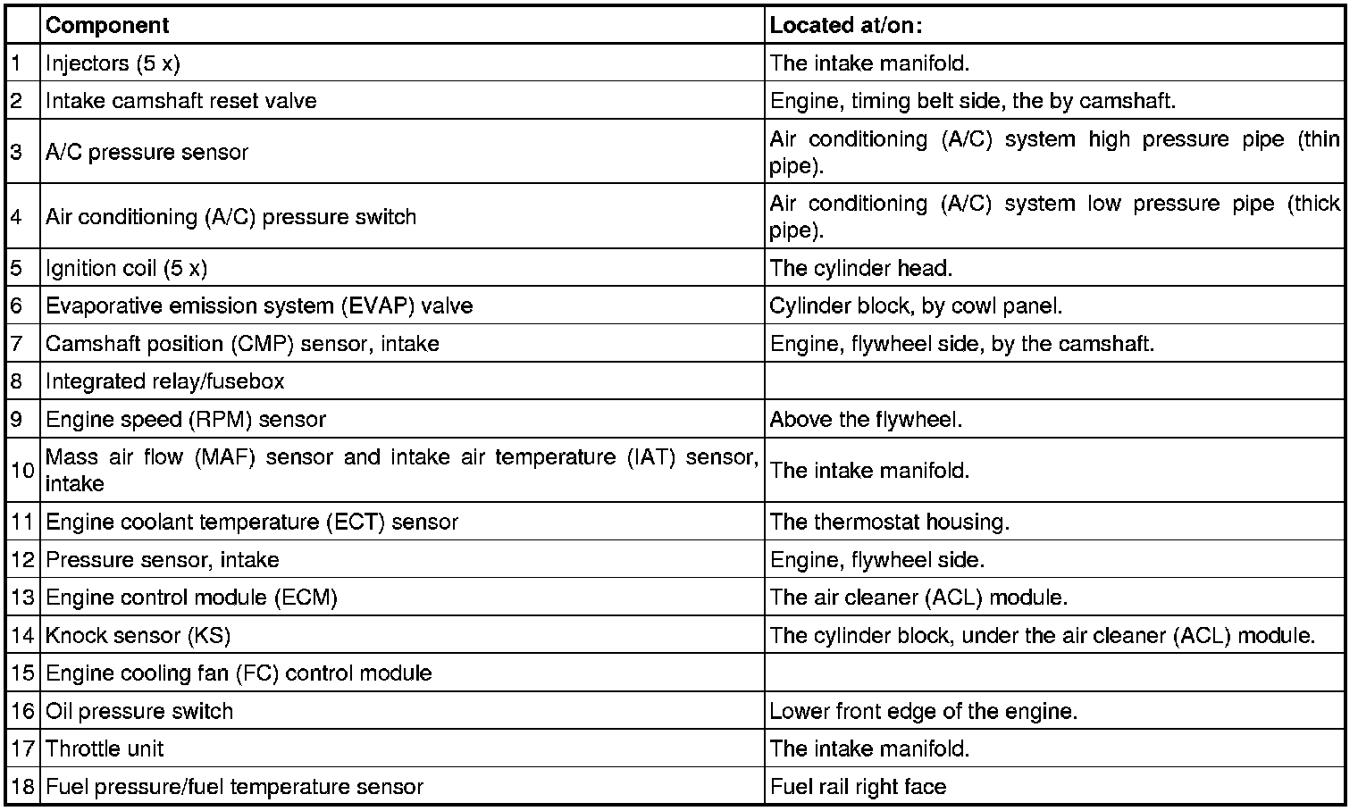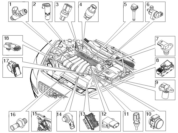 Not all the following components are necessarily in the car. The components vary between engine types.