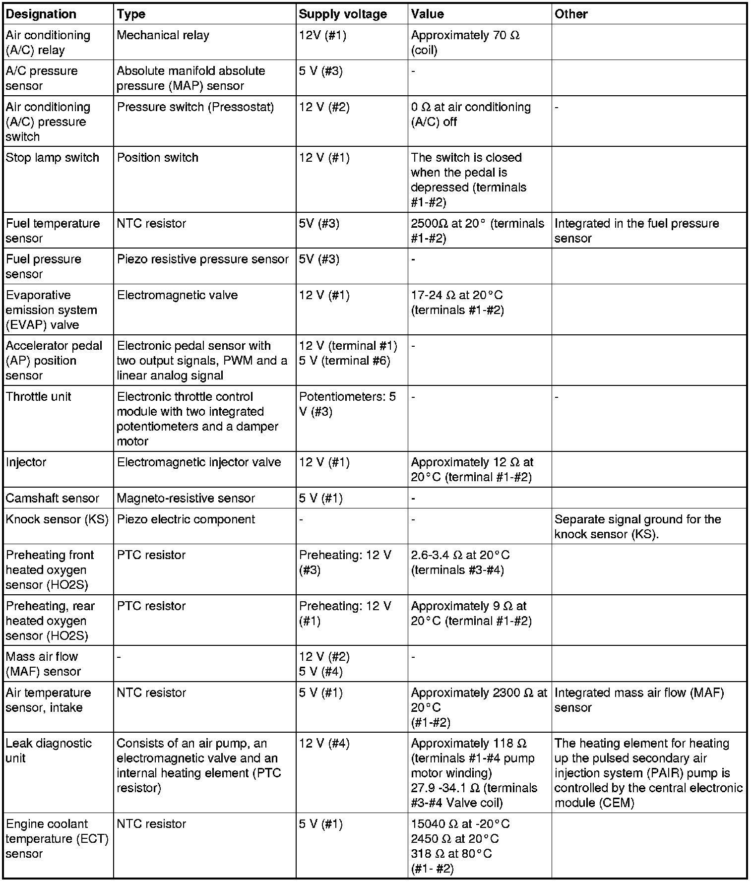 The component specification gives the value of the component when the connector is disconnected. Where no value is given, it is not possible to measure a relevant value at the component.