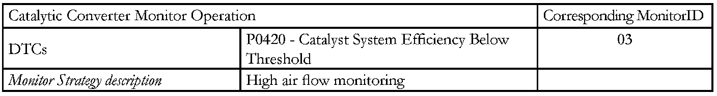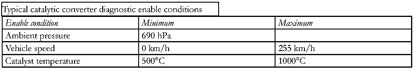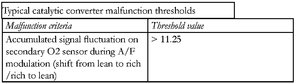 The three-way catalytic converter (TWC) stores oxygen found in the exhaust gases and uses it to make toxic gases less dangerous. The catalytic converter is a TWC converter in which hydrocarbons (HC) and carbon monoxide (CO) are oxidized and oxides of nitrogen (NOx) are reduced. As the TWC ages its ability to store oxygen drops. This reduces the conversion capacity of the TWC. To avoid dangerous emissions the ECM checks TWC efficiency. This check is carried out as follows. Rich and lean lambda pulses are sent through the TWC. For a TWC with good gas converter and large oxygen storage capacity, it will take a long time for the rich/lean pulse to reach the rear oxygen sensor. The rear oxygen sensor will then have long rich and lean pulses and a long time between switches.