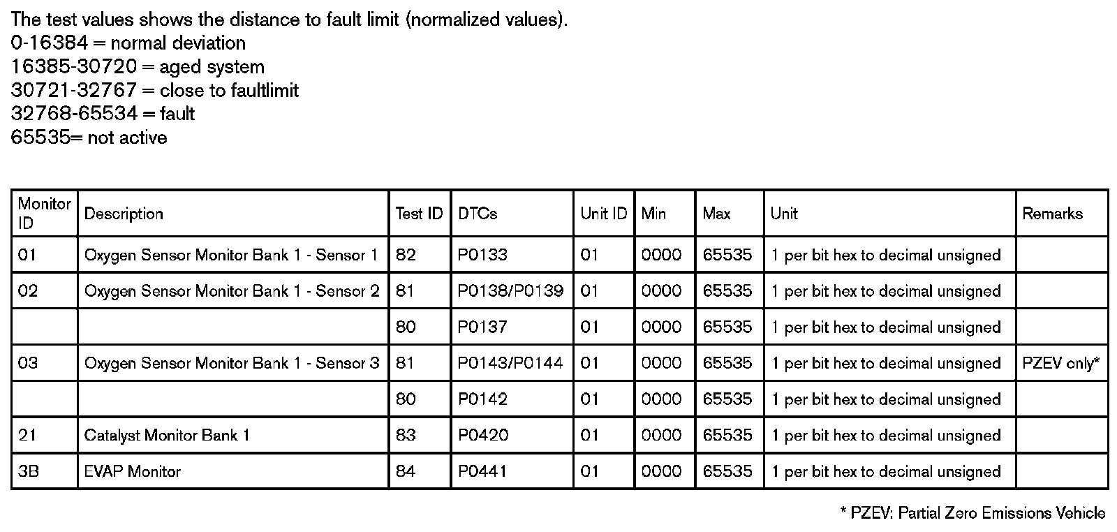 The request message for test values includes an On-Board Diagnostic Monitor ID, see Annex D (ISO/DIS 15031-5.3) that indicates the information requested. Unit and Scaling information is included in Annex E (ISO/DIS 15031-5.3).