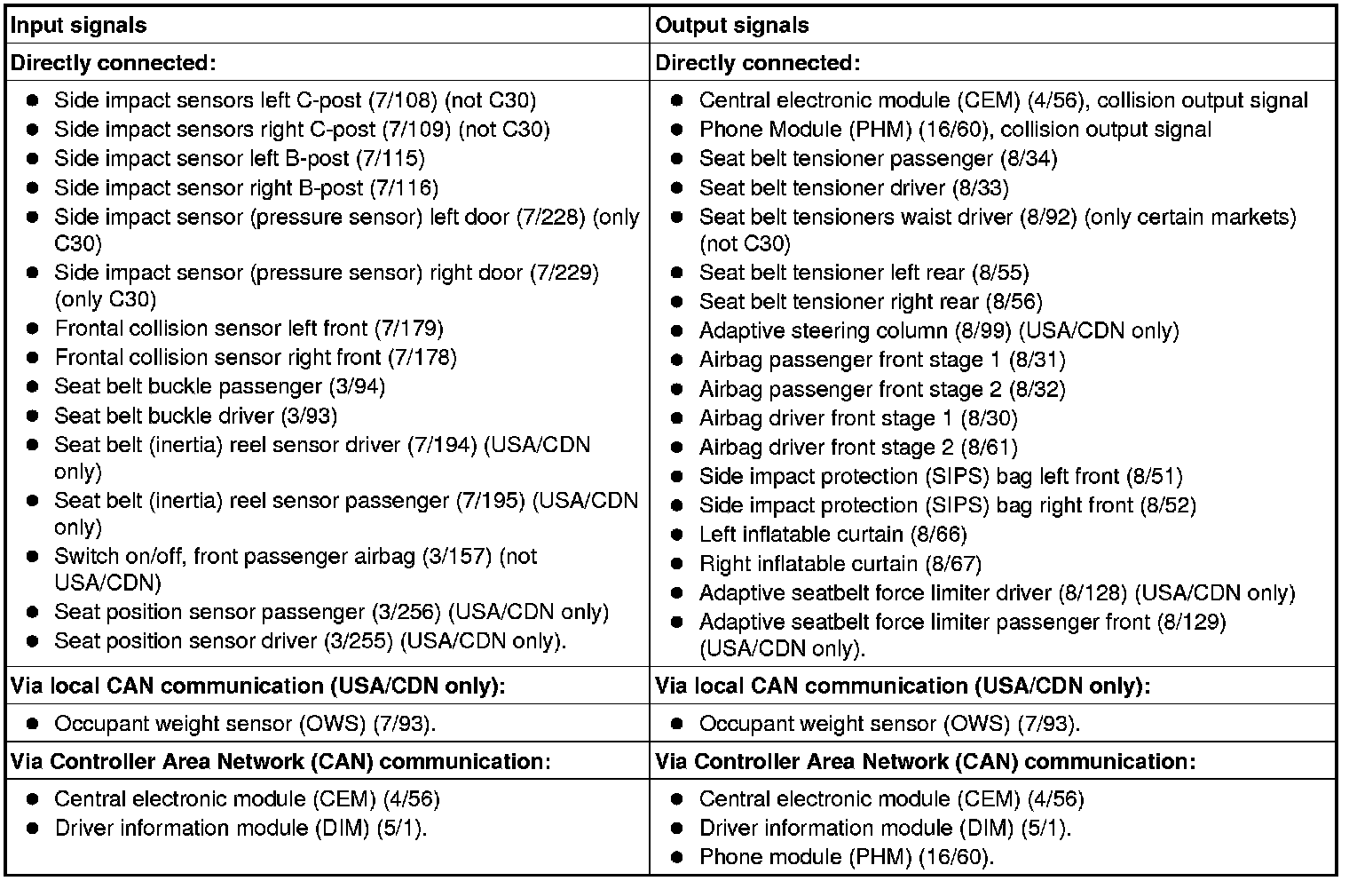 The table below summarizes the input signals to and output signals from the supplemental restraint system module (SRS). The signal types are divided into directly connected signals and CAN communication. The illustration below displays the same information with the Volvo component designations.