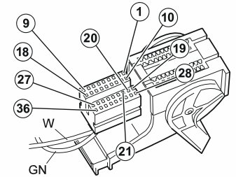 - Connect the green (GN) cable to position 20 in the connector. Connect the white (W) cable to position 21.