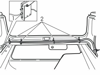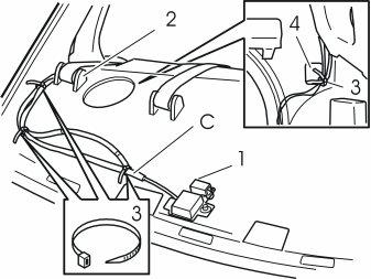 - Route the new cable (C in the kit illustration) to the Global Positioning System (GPS) antenna. Follow the routing of the existing loudspeaker cable inside the seat belt holder (2)