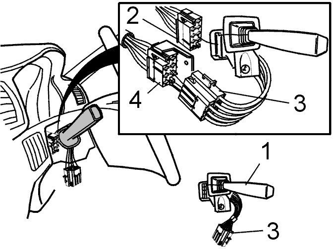 Connect the 6-pin connector (3) from the lever to the connector (4), on the left-hand side of the steering column.