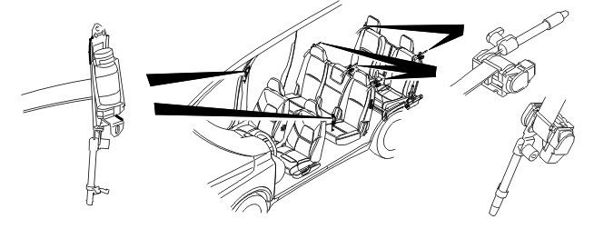 Depending on the model and market, there may be up to seven seat belt tensioners in the vehicle. Two in the front seat, three in the rear seats and two in the third row if applicable. The seat belt tensioners contain an explosive charge which tensions the seat belts when deployed. The seat belt tensioners are separated from each other electrically. This means that each seat belt tensioner has a separate individual power supply and ground from the control module.
