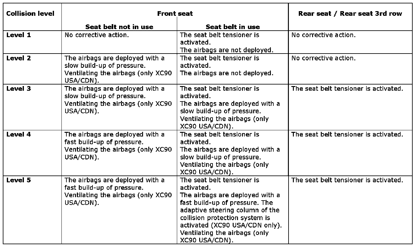 The table below shows how the SRS system reacts in the event of a frontal impact.