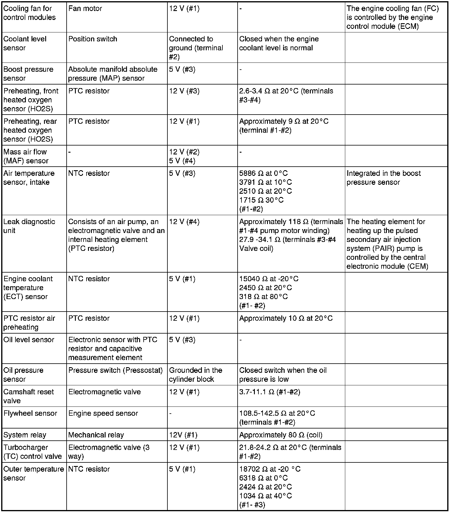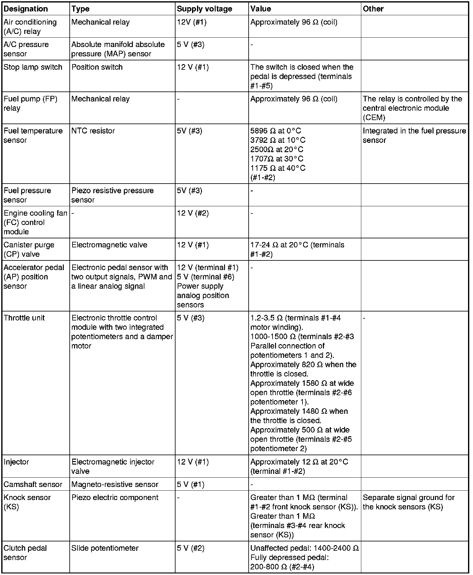 The component specification gives the value of the component when the connector is disconnected. Where no value is given, it is not possible to measure a relevant value at the component.
