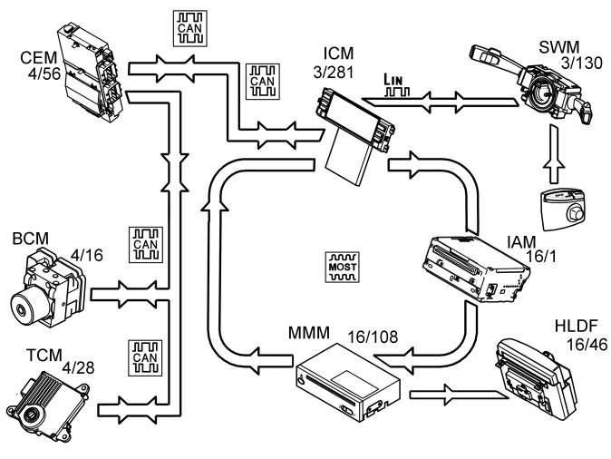 Information from these control modules is sent to the infotainment control module (ICM) (3/281), which then distributes the information to the multimedia module (MMM).