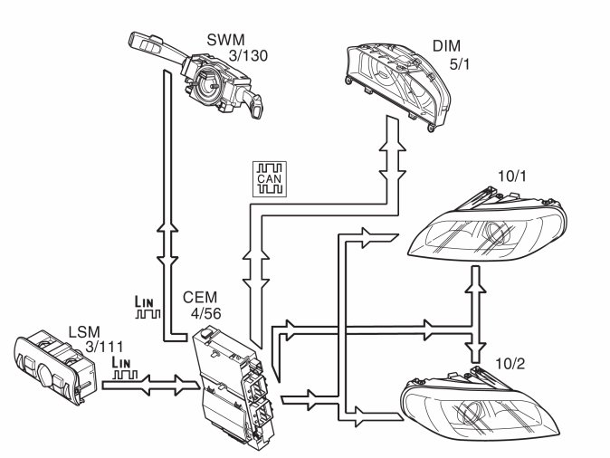 The central electronic module (CEM) (4/56) receives a request to turn on the lamps from the light switch module (LSM) via LIN communication.