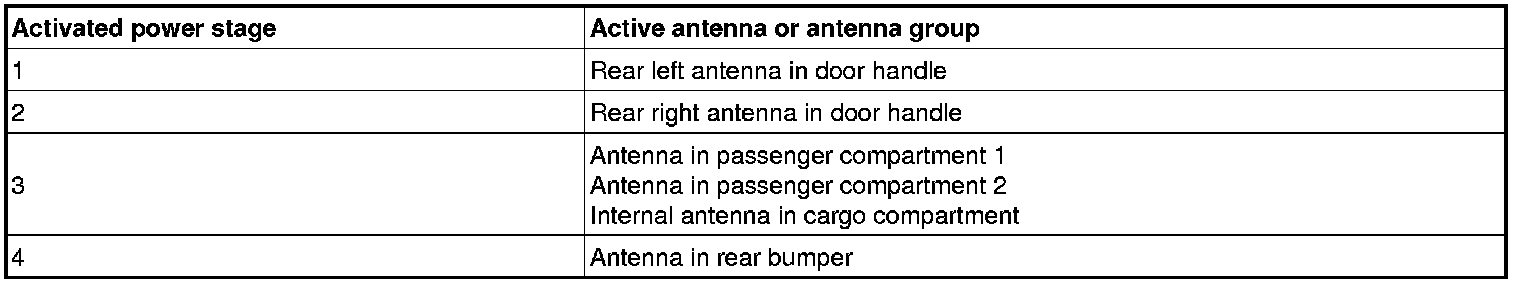 The keyless vehicle module (KVM) contains 4 power stages. The control module uses these relays to select the antennas to be activated. See the table below: