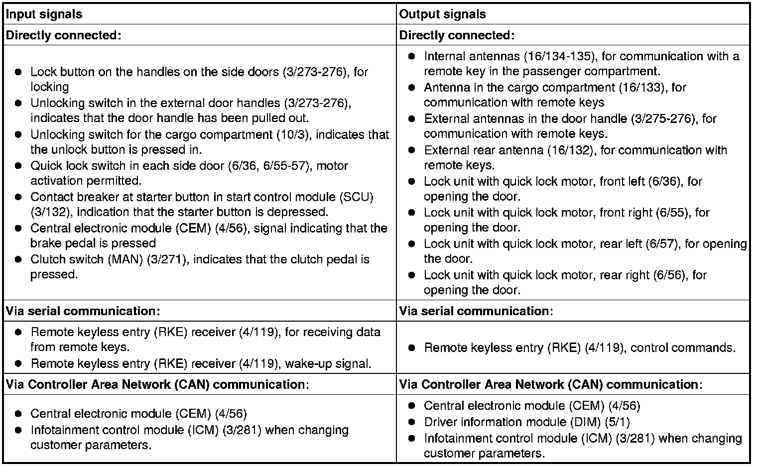 The table below summarizes the input signals to and output signals from the keyless vehicle module (KVM). The signal types are divided into directly connected signals, serial communication and controller area network (CAN) communication. The illustration below displays the same information with the Volvo component designations.
