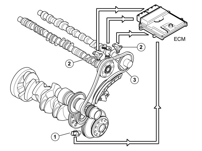 The engine control module (ECM) detects the position of the camshafts by comparing the signals from the engine speed (RPM) sensor (1) (crankshaft position) and the camshaft position (CMP) sensors (2) (camshaft positions). The engine control module (ECM) then controls the angle of the camshaft by controlling the oil flow to the CVVT unit using the reset valve camshaft (3).