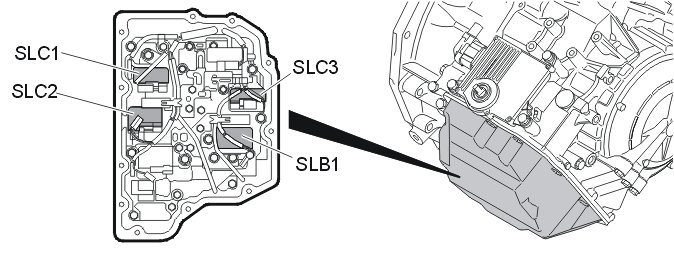 The linear pressure solenoids , SLC1, SLC2, SLC3 and SLB1 are located in the transmission control system, which is fitted on the front edge of the gearbox. The designation of the solenoid is linked to the component (clutch/brake band) that the solenoid controls. The linear pressure solenoids consist of an electrical coil which controls a hydraulic valve. The solenoids are controlled with a pulsed (PWM) voltage and are grounded via the transmission control module (TCM). The hydraulic function of the solenoids is linear. The hydraulic valves are controlled by the varying current resulting from the current pulse ratio. With a high pulse ratio, i.e. high current strength (approx. 1 A), the system pressure is low, and with a low pulse ratio, i.e. low current strength, the system pressure is high. In the event of an open circuit the system pressure is at a maximum which results in hard gearshifts. Here the hydraulic valve is fully open.