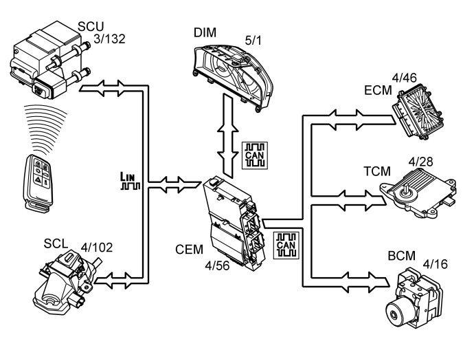 The central electronic module (CEM), Driver information module (DIM) and steering column lock module (SCL) are part of the steering column lock function. The power supply to the Steering column lock module (SCL) is controlled by the Driver information module (DIM) via a relay in the Central electronic module (CEM). The steering column lock module (SCL) also receives commands from the central electronic module (CEM) to lock or unlock the steering column lock. The steering column lock only permits a function to be carried out when the vehicle is not in motion and the engine is off.