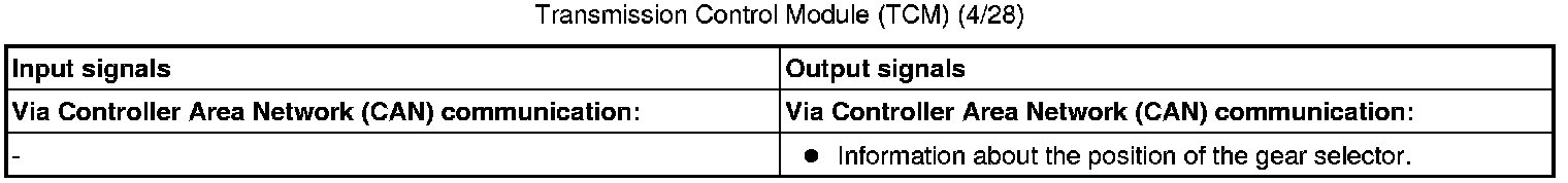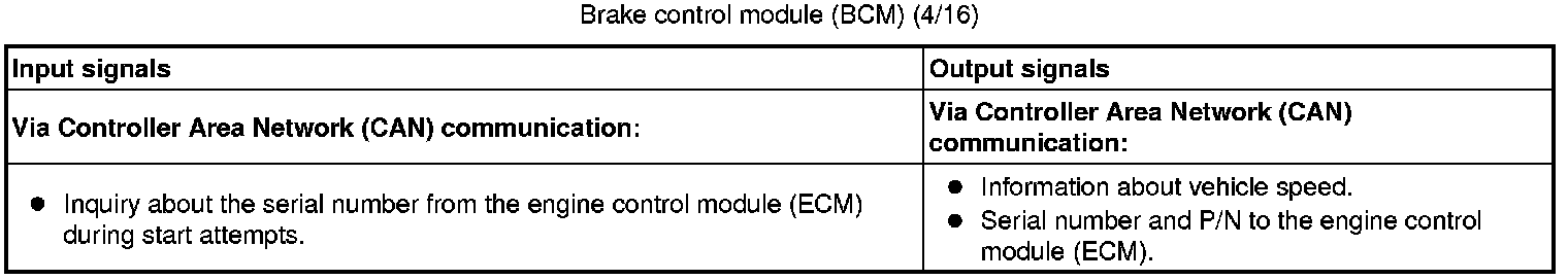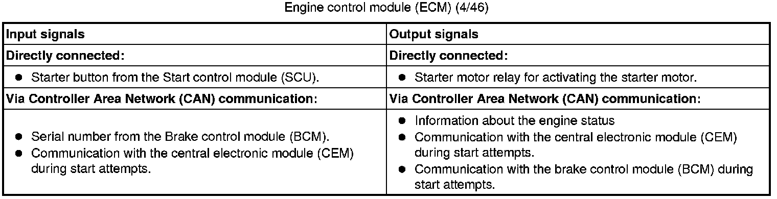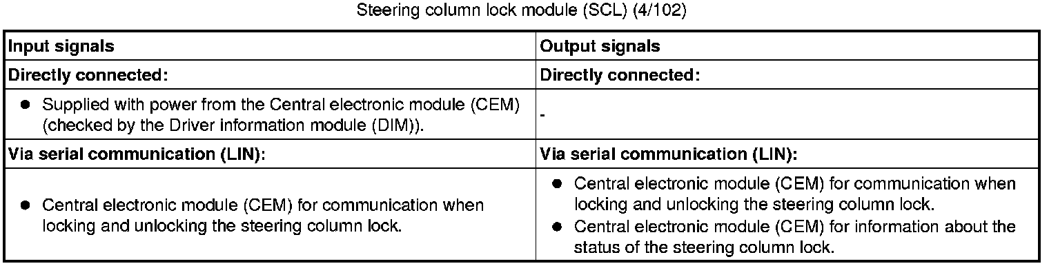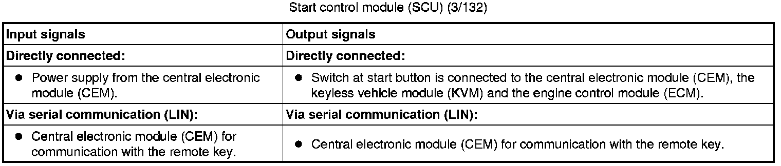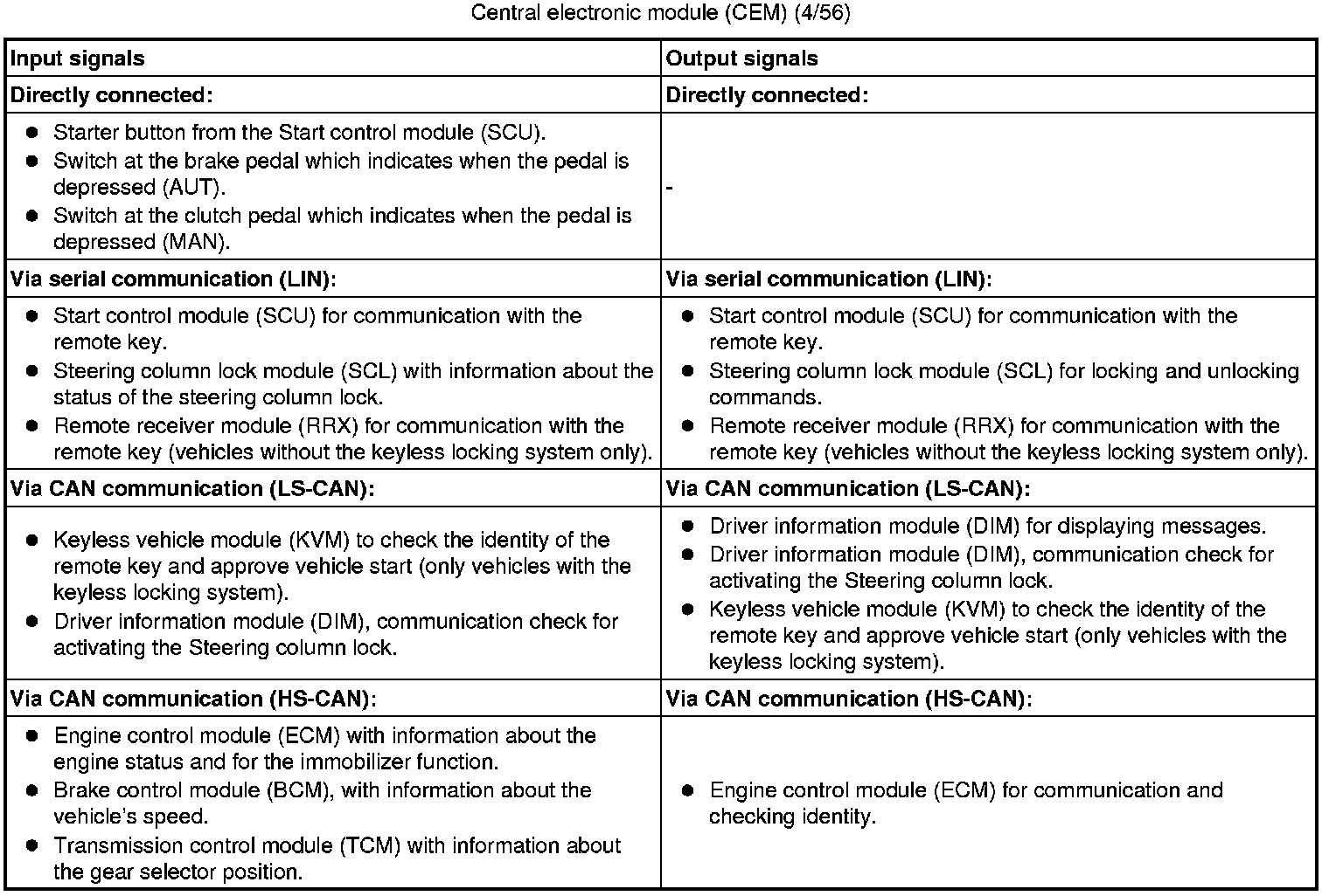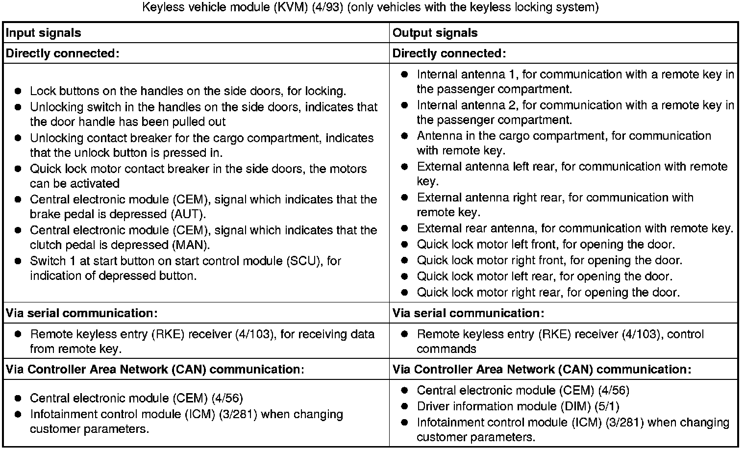 The tables below summarize the input and output signals to the units in the system for the immobilizer. The signal types are divided into directly connected signals, serial communication and controller area network (CAN) communication.