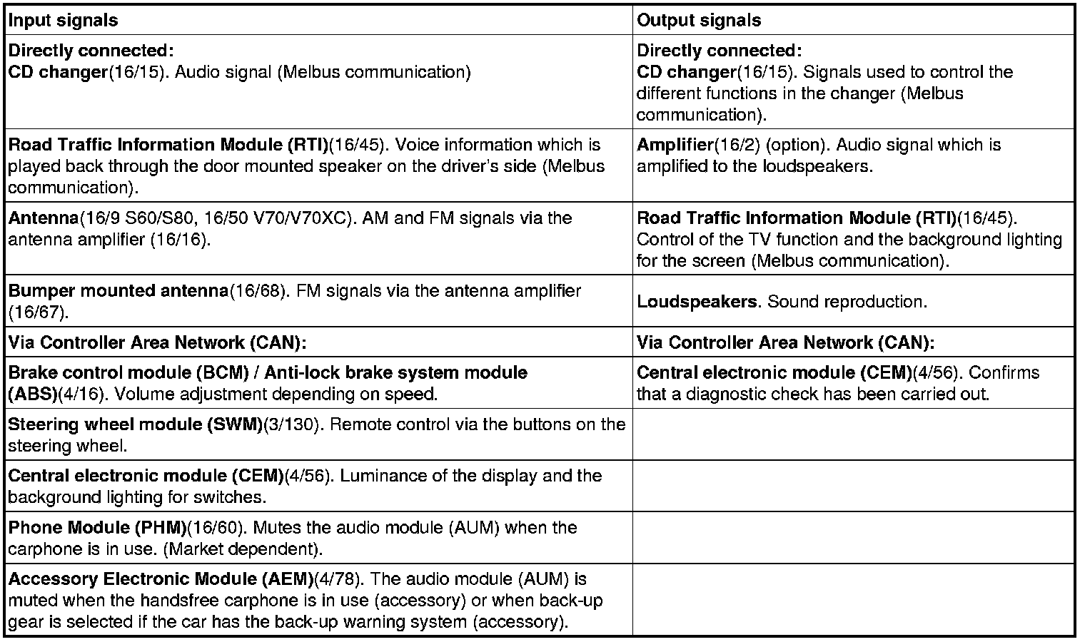 The table below summarizes the input signals to and output signals from the audio module (AUM). The signal types are divided into directly connected signals and Controller area network (CAN) communication. The illustration below displays the same information with the Volvo component designations.