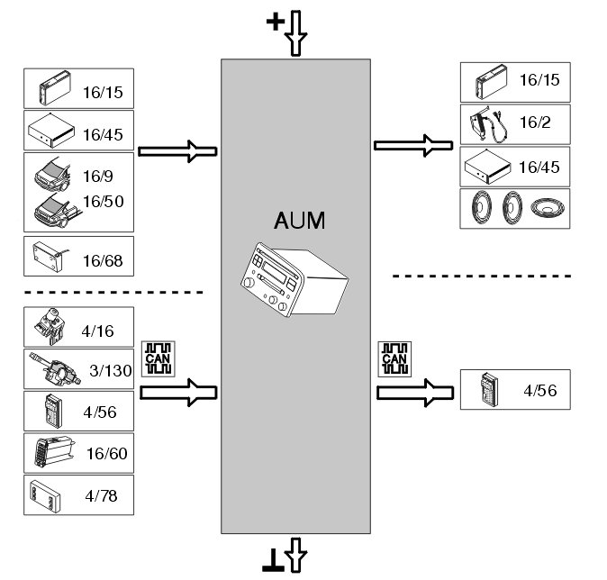 The audio module (AUM) communicates with directly connected components and with other control modules and components connected via Controller area network (CAN) communication.
