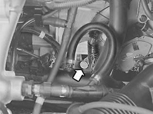 Warning! The lower engine coolant hose positioned by the dip stick is extremely hot. Use protective gloves when moving the hose to the side.