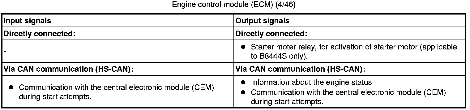 The tables below summarize the input and output signals to the units in the system for the immobilizer. The signal types are divided into directly connected signals, serial communication and controller area network (CAN) communication.