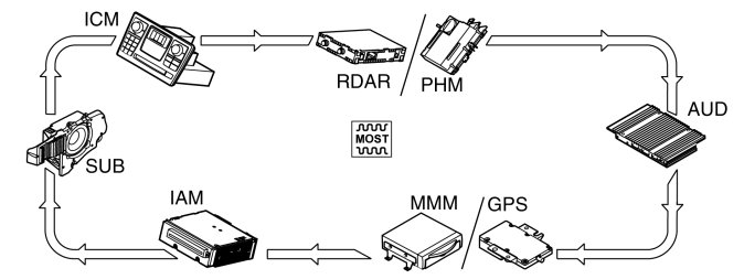 The MOST network uses the master-slave concept. This means that a master control module, infotainment control module (ICM) has overall control of communication on the MOST network.