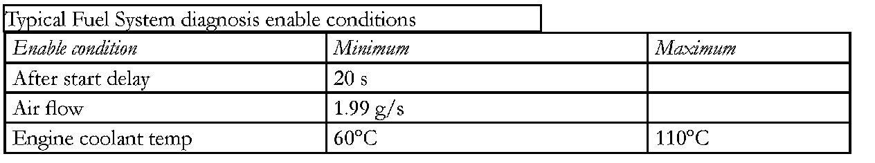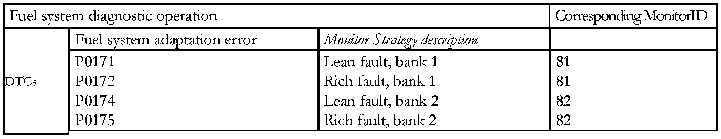 The fuel system diagnosis monitor the long term fuel trim adaptations, to check if any of the adaption points has reached it's limits (rich or lean), and no more adaption is possible. This will not immediately lead to higher emissions, because the short-term fuel trim can take care of additional faults. The long term fuel trim is calculated from the front linear oxygen sensor, and there are 6 times 6 (depending on load and engine speed) different adaptation points. Each point is monitored in order to check if it is higher/lower than the threshold value.