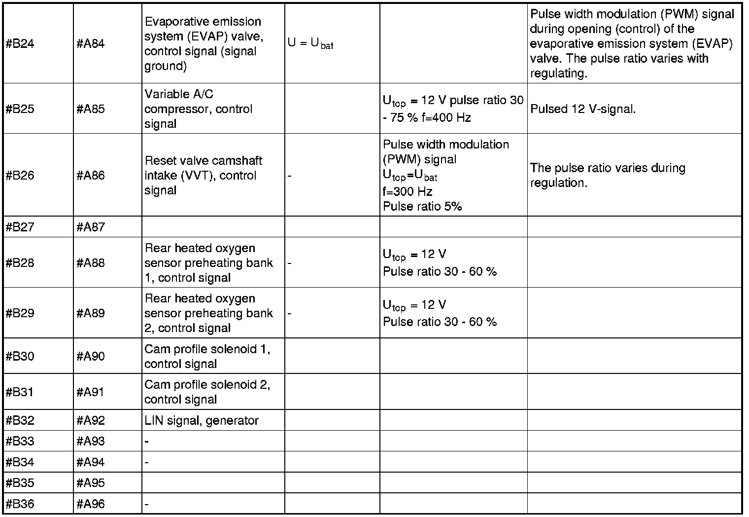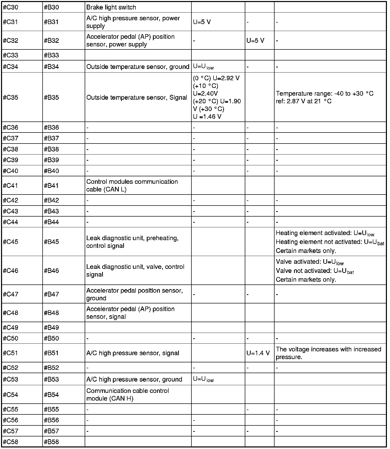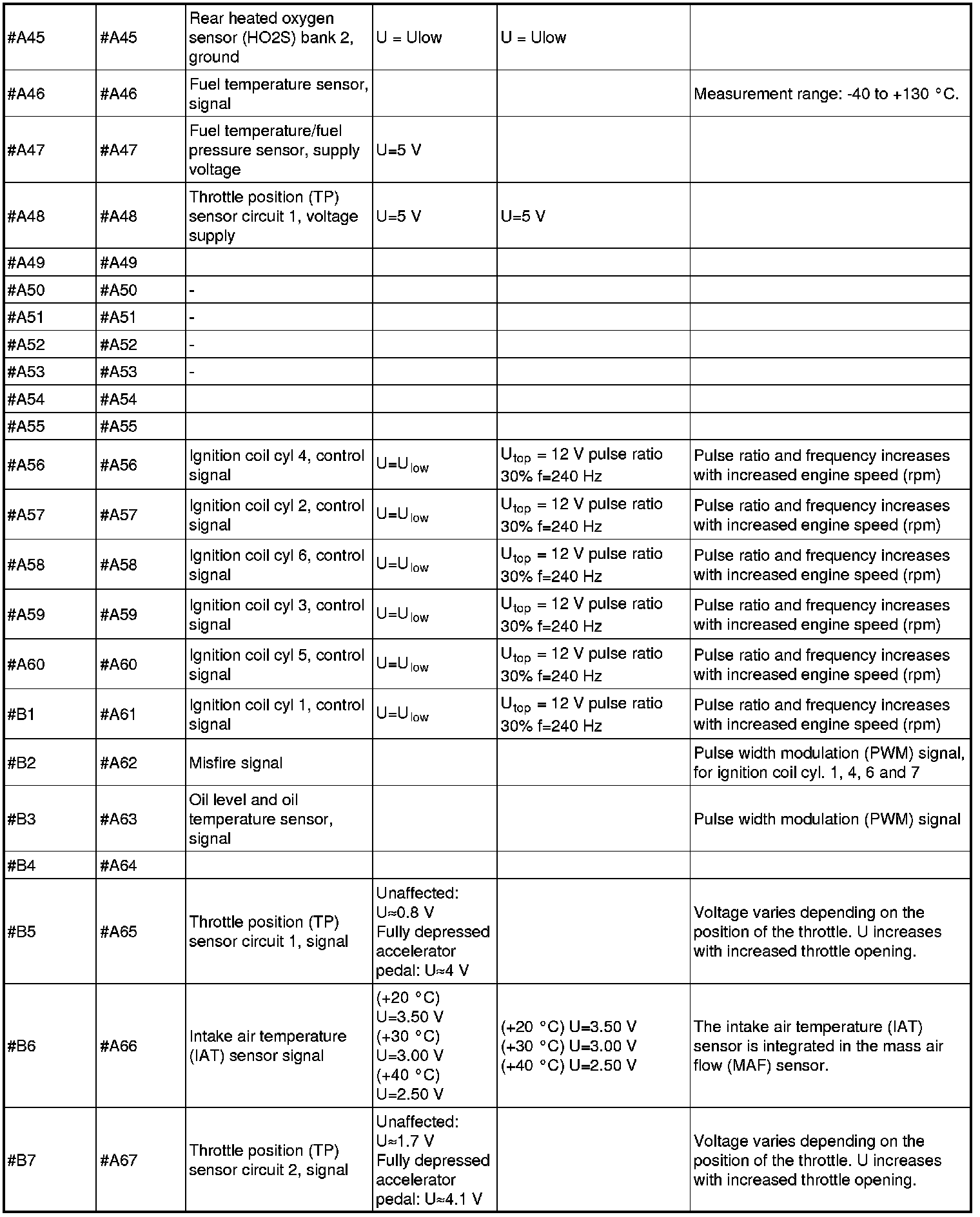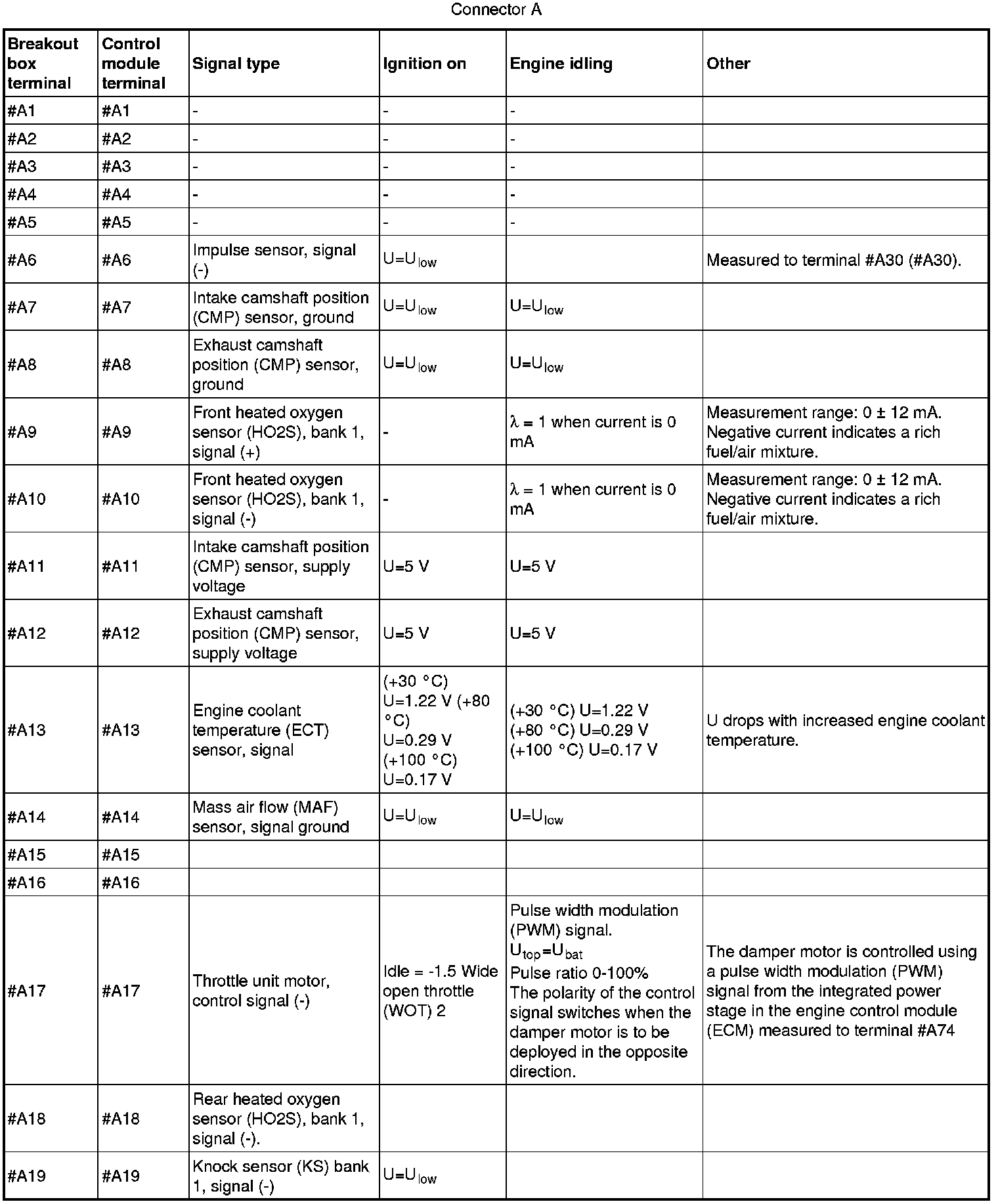 All values indicated below are between respective connection in column 1 and #A C2 on the breakout box. If this is not the case, it is indicated within brackets.