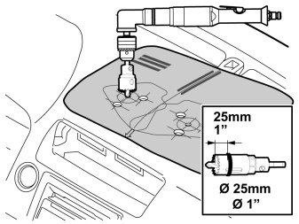 - Drill for the connection of the connector. Drill through all layers of the dashboard. Use a 25 mm (1")drill stop.