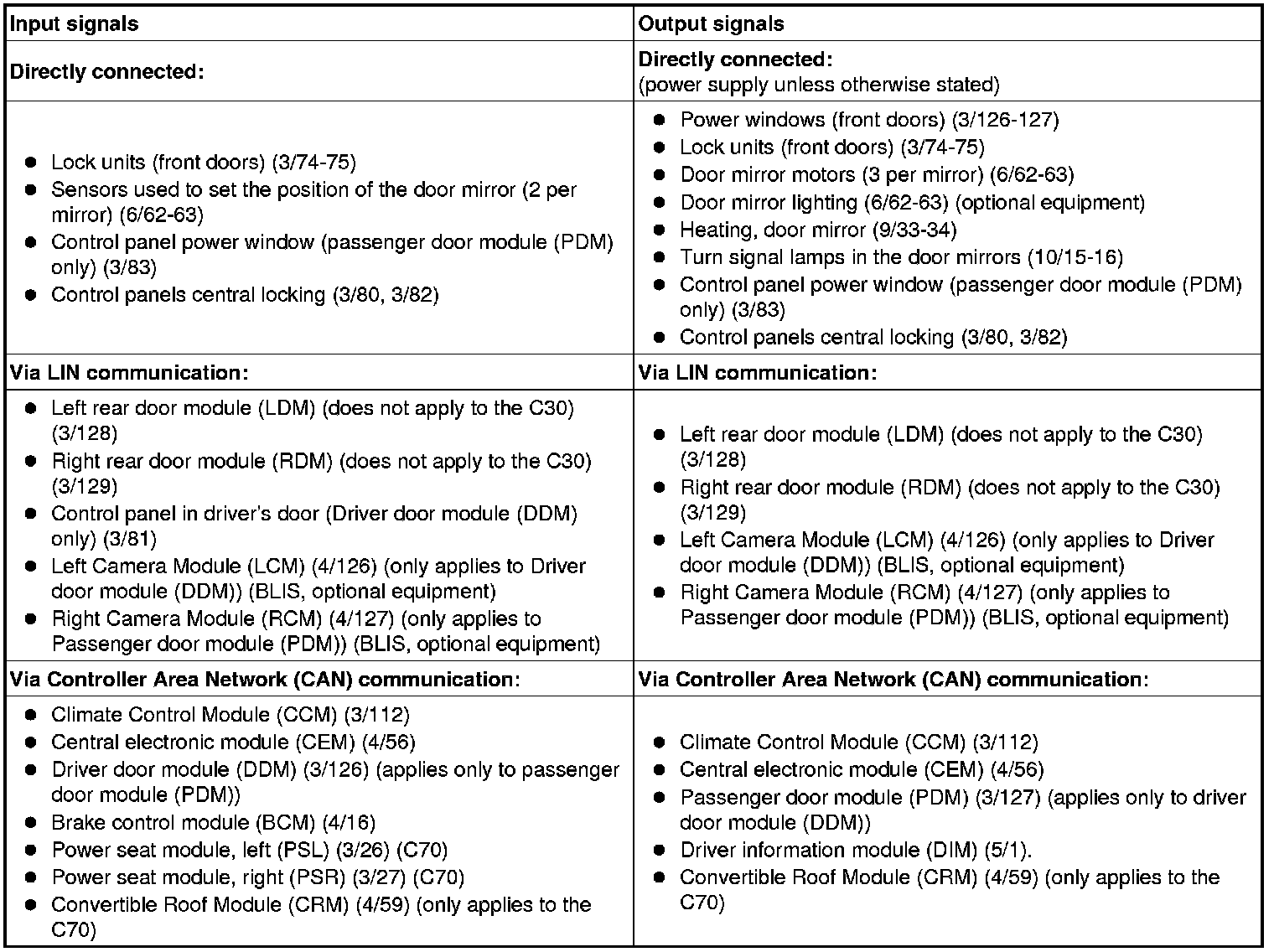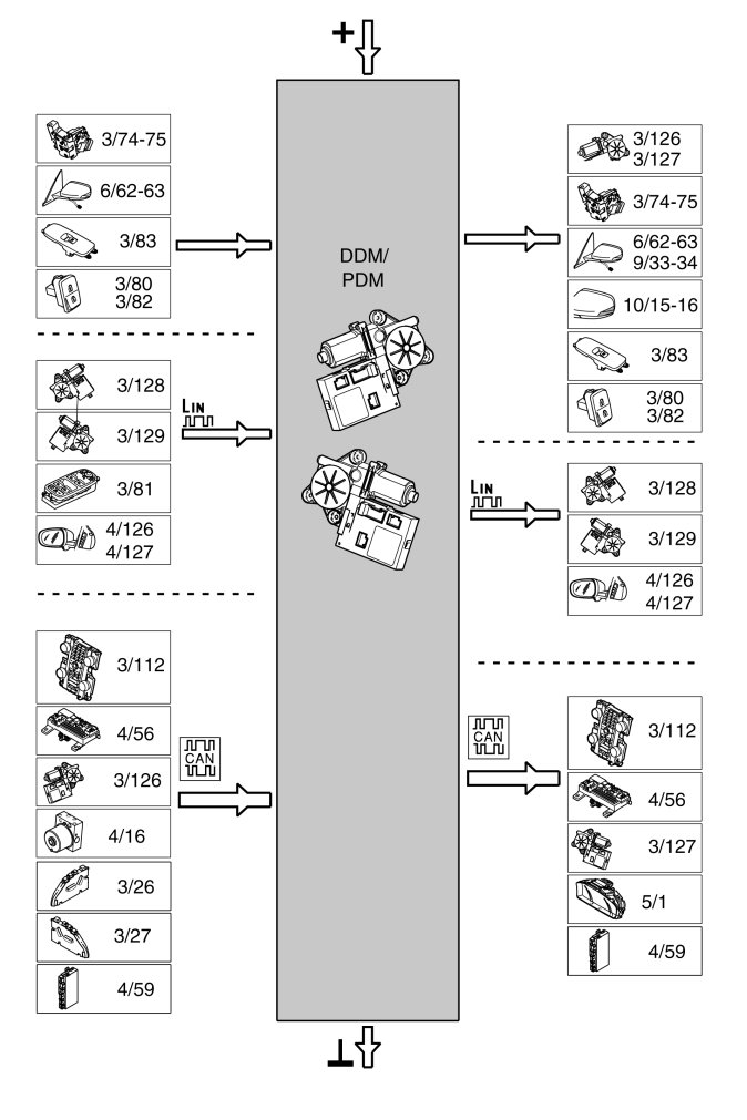 The Driver door module (DDM) and Passenger door module (PDM) communicate with the control module for the rear doors on its respective side of the vehicle via LIN communication (does not apply to the C30).