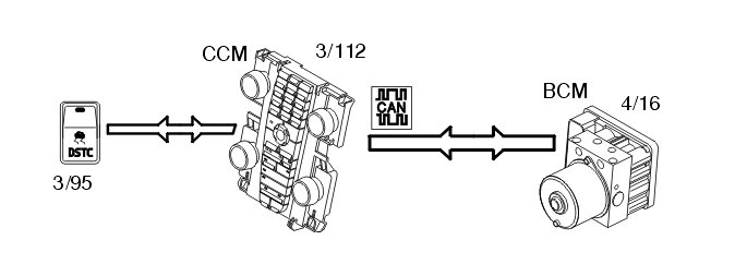 The STC/DSTC function is activated using the switch (3/95) on the center console. The ignition key must be in position II and the engine running for the climate control module (CCM) (3/112) to accept activation of this function. During activation and deactivation, the climate control module (CCM) transmits a signal indicating the selected status for STC/DSTC to the brake control module (4/16) via the controller area network (CAN).