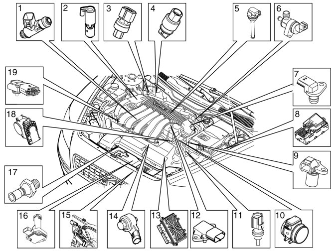 Not all the following components are necessarily in the car. The components vary between engine types.