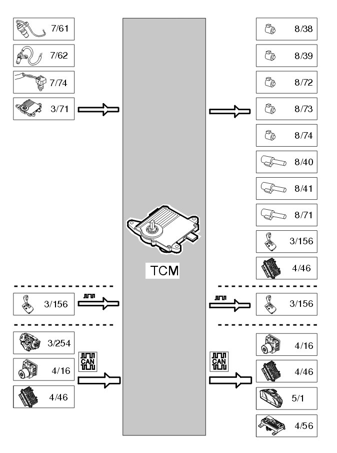 - Transmission control module (TCM) - Controls activation and deactivation of the solenoids by processing the signals from components such as the transmission input and output speed sensors and the temperature sensor. Also stores adaptive data as well as diagnostic trouble codes (DTCs) and frozen values for diagnostics
