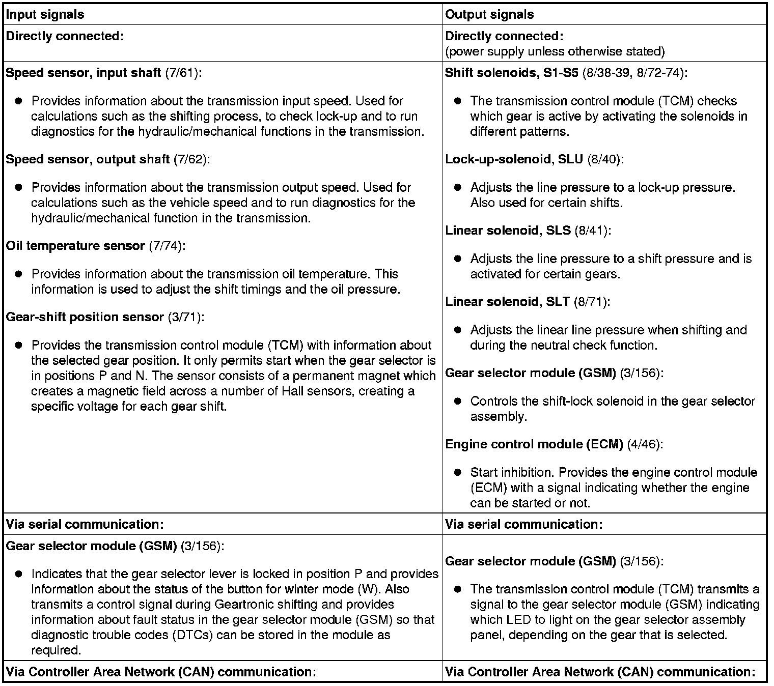 The table below summarizes the input signals to and output signals from the transmission control module (TCM). The signal types are divided into directly connected signals, serial communication and controller area network (CAN) communication. The illustration below displays the same information with the Volvo component designations.