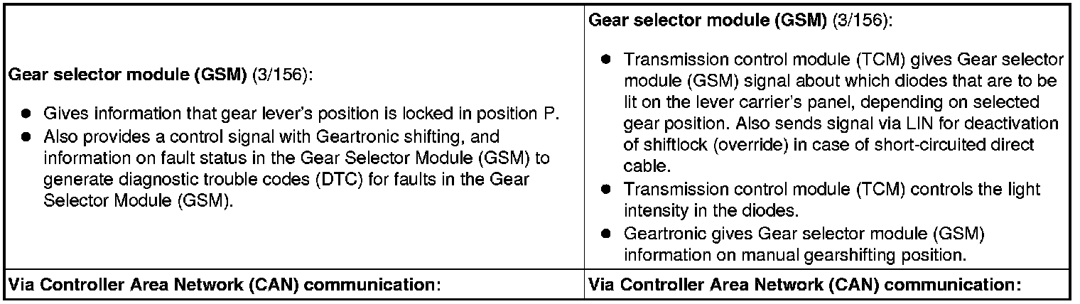 The table below summarizes the input and output signals to and from the transmission control module (TCM). The signal types are divided into directly connected signals, serial communication and CAN communication. The illustration below displays the same information with Volvo component designations.