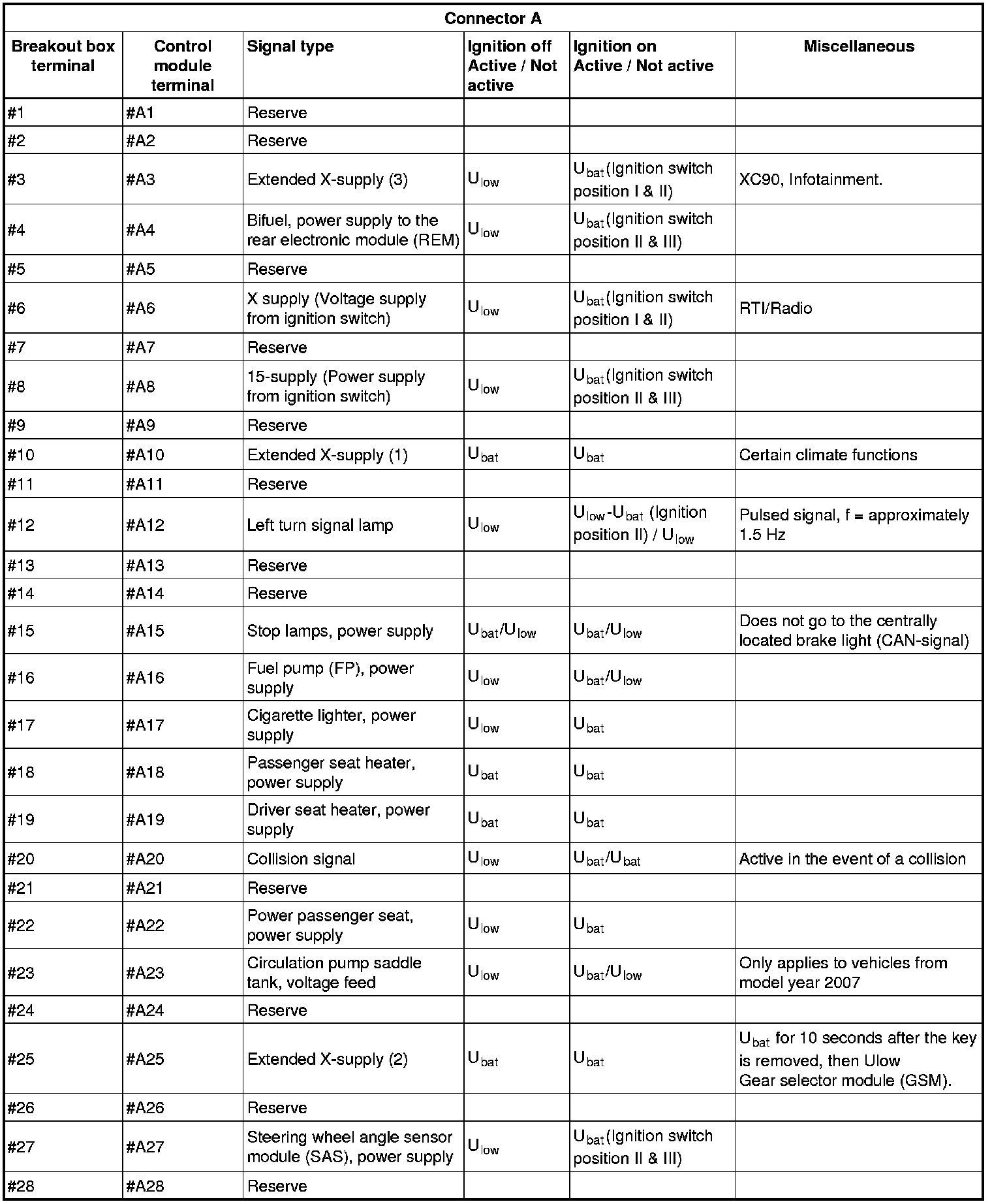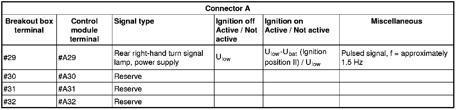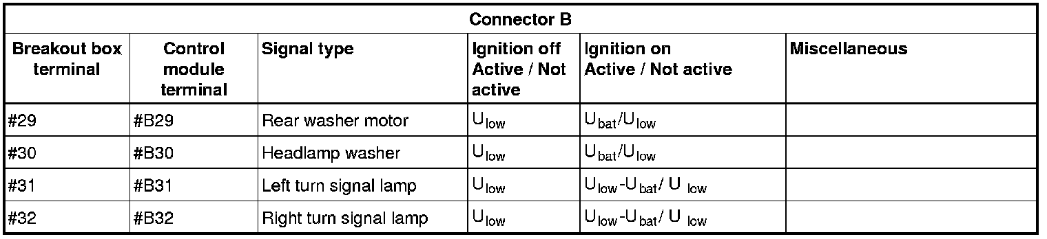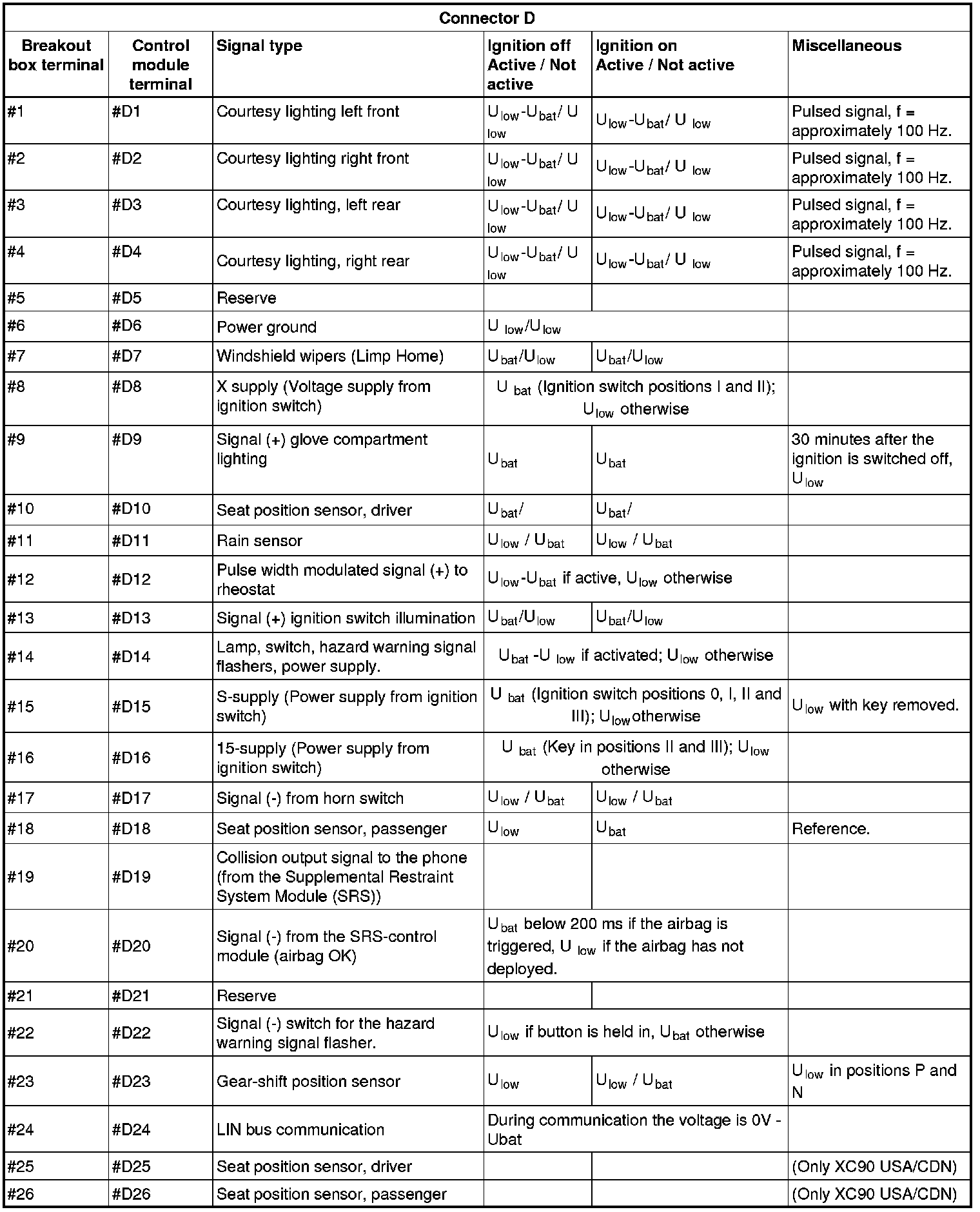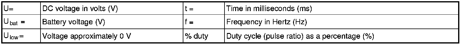 All the values given below are between the terminals stated in column 1 and terminal #D6 in column 2 (power ground). This applies unless otherwise indicated in the last column.