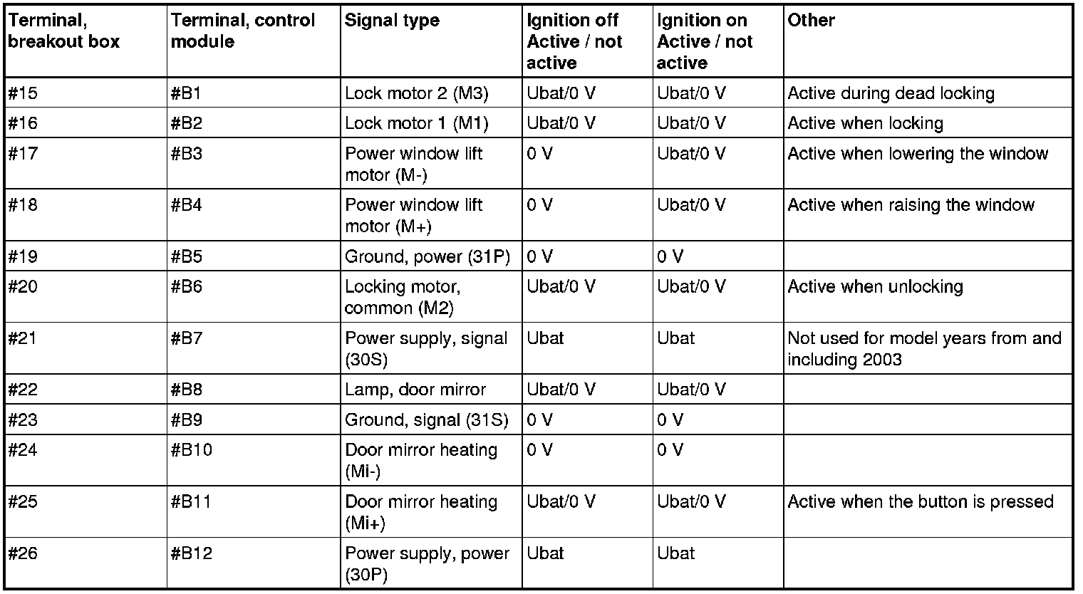 The following values are measured between the relevant terminal in column 1 and terminal #B9 (signal ground) unless otherwise stated.