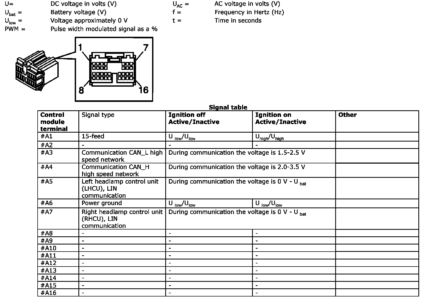 All the values given below are between the respective terminal in column 1 and terminal #A6 in column 1 (power ground), if this is not the case, it is indicated within brackets.