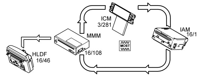 Information for voice guidance to the selected destination is sent between the multimedia module (MMM) and integrated audio module (IAM) (16/1) via the MOST network.