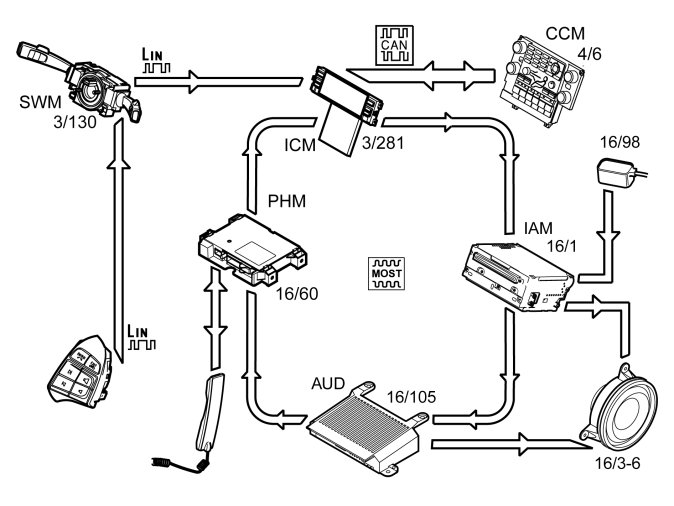 When using the menu via the steering wheel buttons information is transmitted from the steering wheel module (SWM) (3/130) to the infotainment control module (ICM) via LIN communication. The information is then transmitted to the phone module (PHM) via the MOST network.