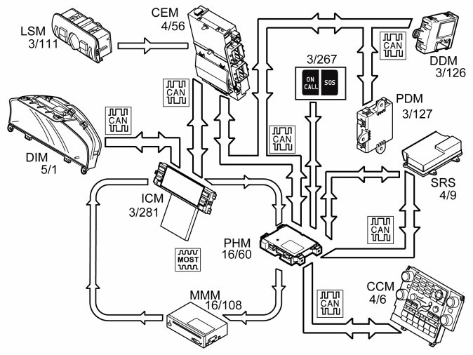 - Ignition switch position. Phone module (PHM) receives information on ignition switch position from the central electronic module (CEM) via the CAN network.