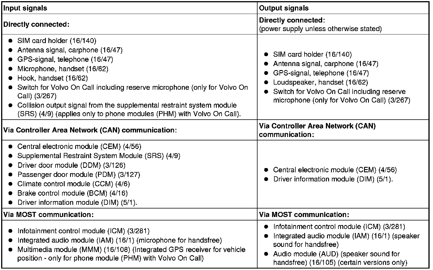 The following table summarizes the input signals to and output signals from the phone module (PHM). The signal types are divided into directly connected signals, MOST and CAN communication. The illustration below displays the same information with the Volvo component designations.