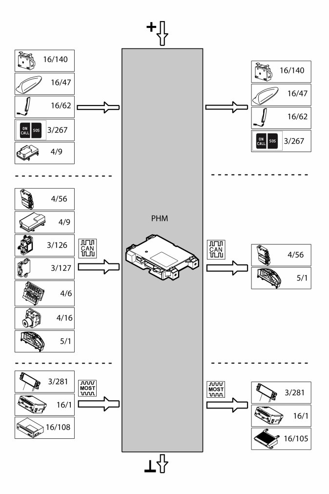 The phone module (PHM) communicates partly with directly connected components and partly with other control modules via the CAN and MOST networks. All diagnostic communication between VIDA and the phone module (PHM) occurs via the CAN network.