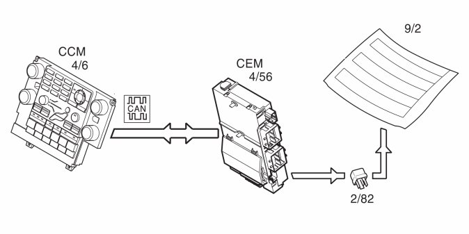 The rear window defroster (9/2) is activated by pressing the switch on the climate control module (CCM) (4/6). The climate control module (CCM) transmits the data to the central electronic module (CEM) (4/56) via the CAN network.