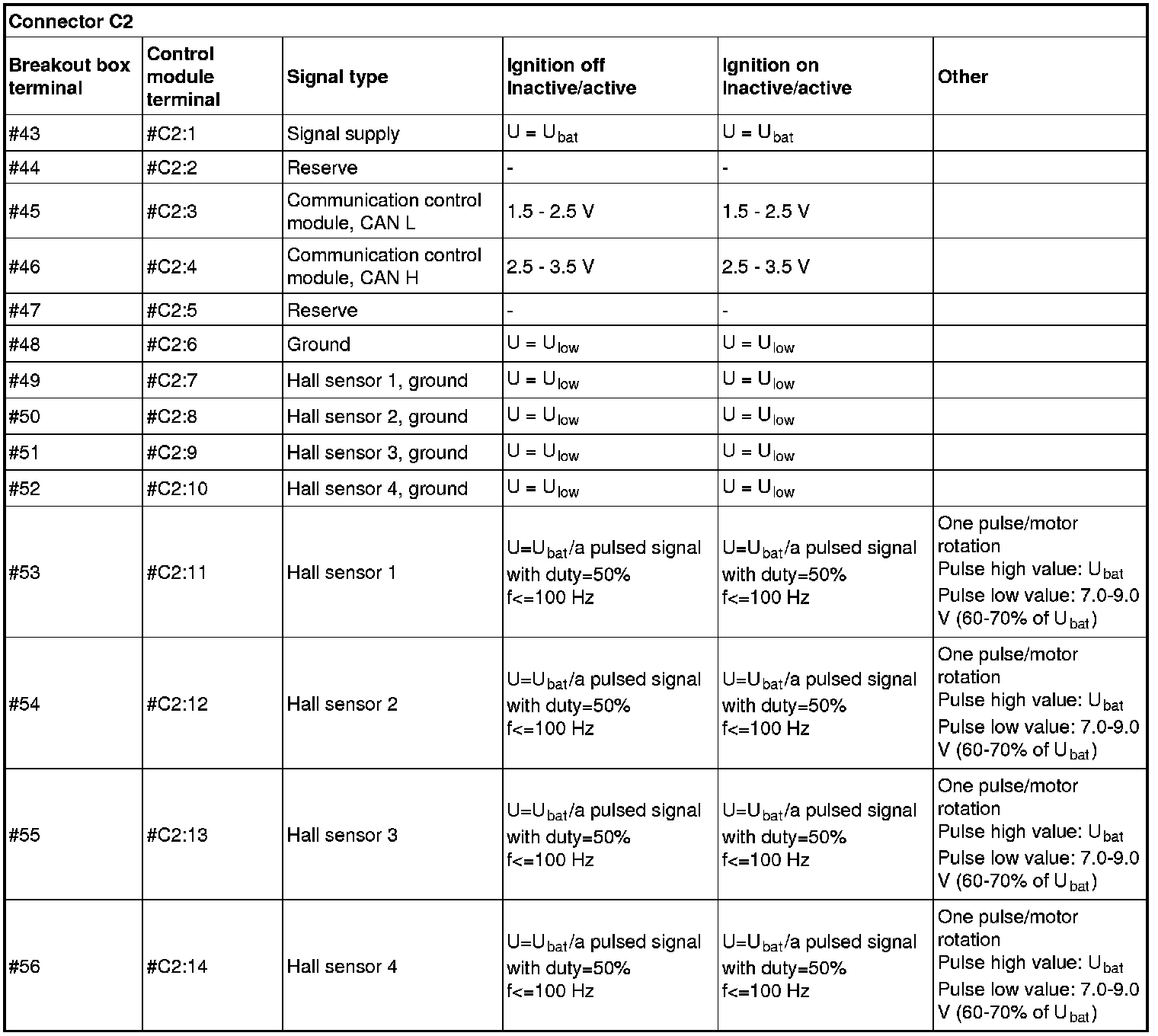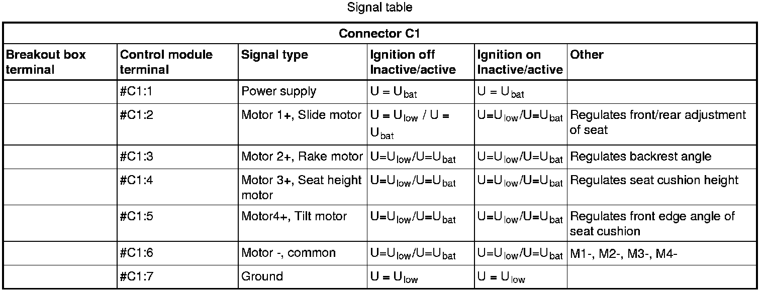 All the values given below are between the respective terminal in column 1 and terminal # C1:7 in column 2 (power ground) unless otherwise stated in brackets after the table entry.