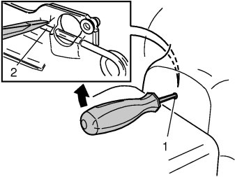 - Pry the screwdriver upwards towards the upper edge of the hole (2) so that the end of the screwdriver presses the spring clip down (1) until one side of the steering wheel module springs out and releases from the mounting.