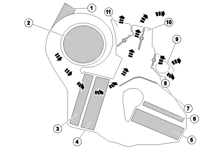 The heat exchanger consist of a tubular coil through which the engine's coolant flows. The tube is fitted with flanges which give off heat to the passing air. The throttle valve in the distribution housing is set so that the blower can force a larger or smaller amount of the air flow through the heat exchanger. Here the air is heated before it is once again mixed with the remaining flow and distributed to the passenger compartment through several different outlets.