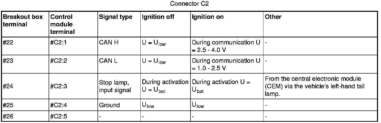 All the values given below are between the terminals stated in column 1 and terminal #C2:4 in column 2 (power ground).