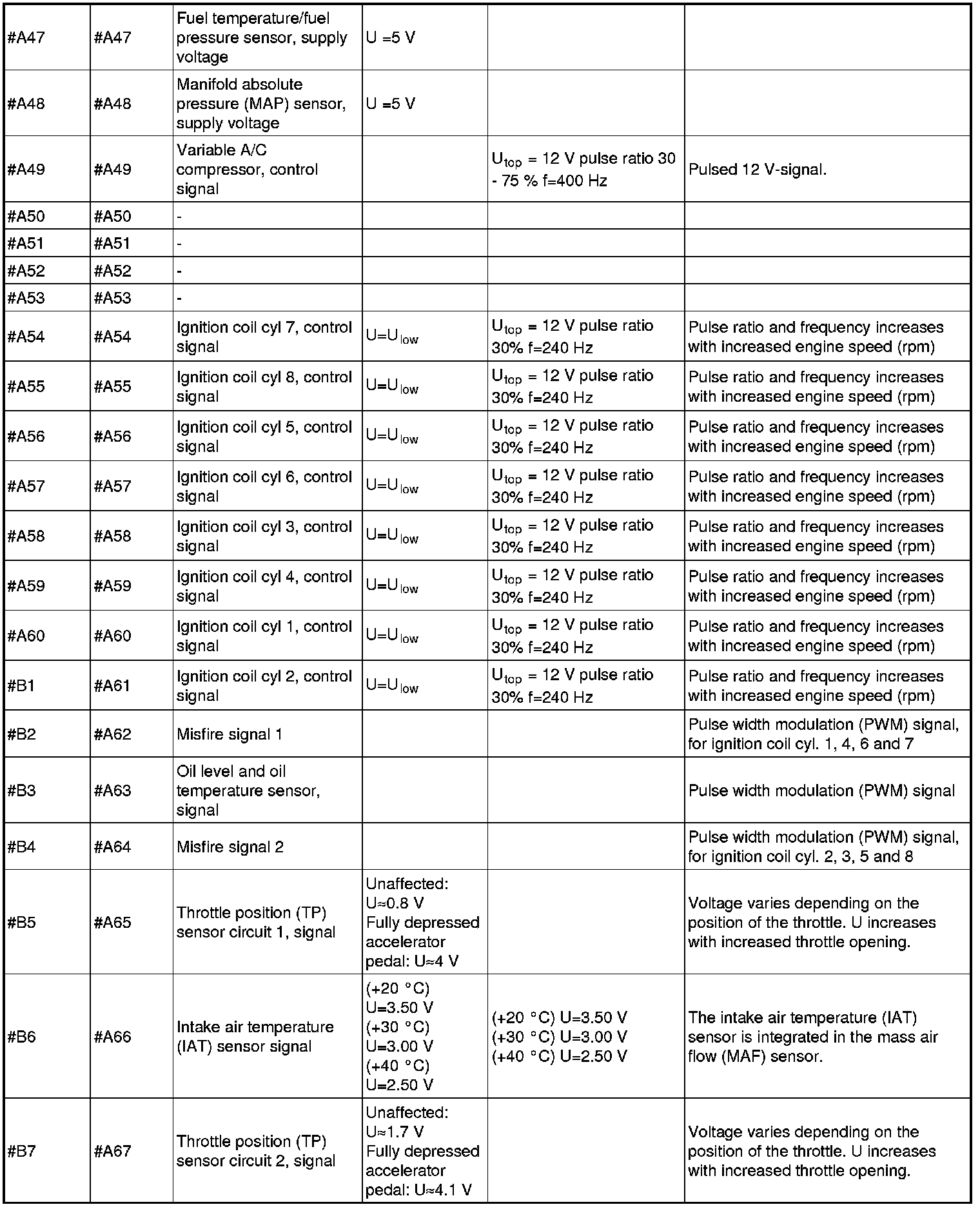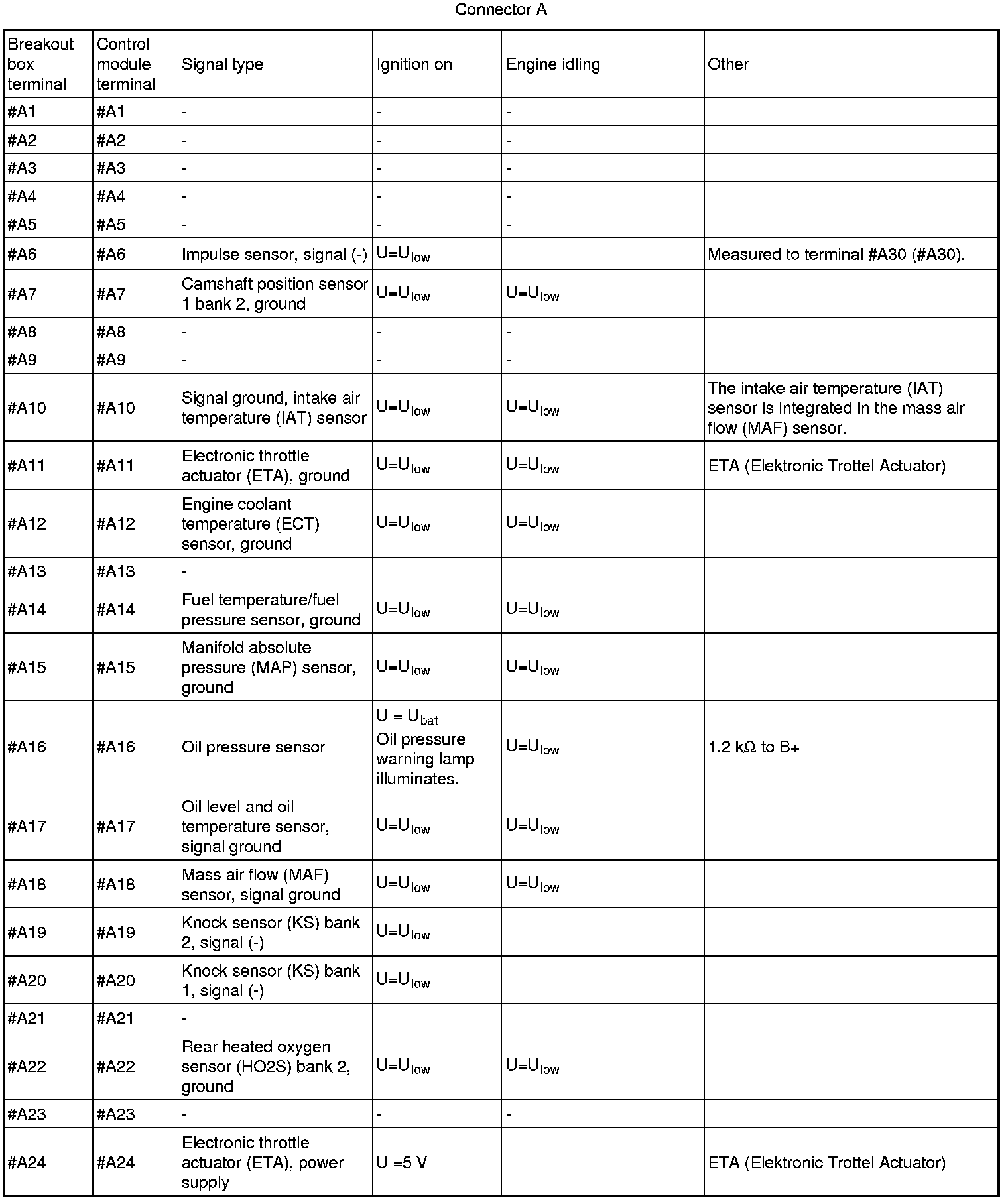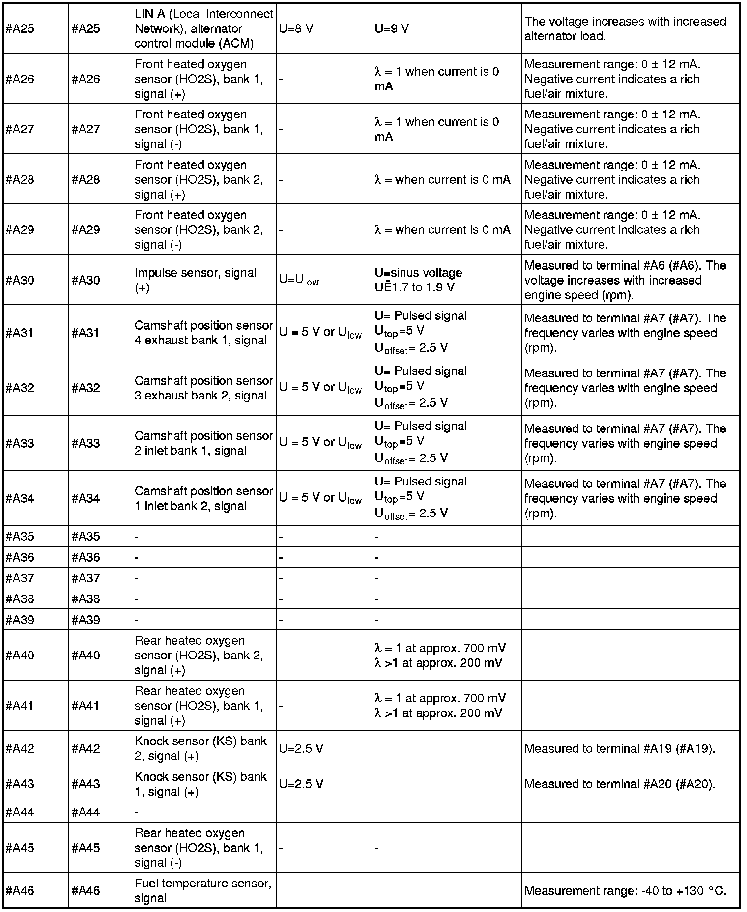 All values below are measured between the relevant terminal in column 2 and #Axx (#Axx on the breakout box) unless otherwise stated in parenthesis after the table entry.